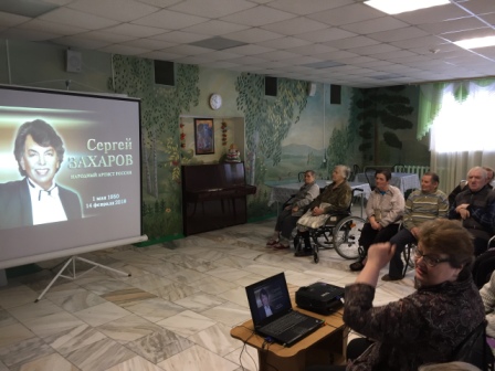 14 февраля этого года не стало легенды советской эстрады Сергея Захарова. По заявкам проживающих стационарного отделения для граждан пожилого возраста и инвалидов, работник Центральной городской библиотеки Надежда Скотникова подготовила и провела бенефис любимого певца «Я не жалею ни о чём. Сергей Захаров». Надежда рассказала слушателям о биографии певца, его личной жизни и как складывалась творческая карьера артиста. Были просмотрены клипы с его исполнением - «Отцвели хризантемы», «Московские окна», «Вечерний звон», зажигательная «зимняя» композиция «Три белых коня» из фильма «Чародеи»… Сергей Захаров подарил слушателю много песен, которые сегодня назвали бы хитами, их распевала вся ст